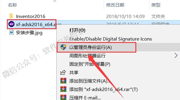 17.打开之前解压后的【Inventor2016】文件夹,选中【xf-adsk2016_64】可执行文件,鼠标右击选择【以管理员身份运行】。