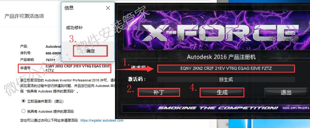 18.使用快捷键Ctrl+C复制申请号,快捷键Ctrl+V粘贴到【请求码】中,点击【补丁】在弹出来的窗口中点击【确定】,然后点击【生成】。