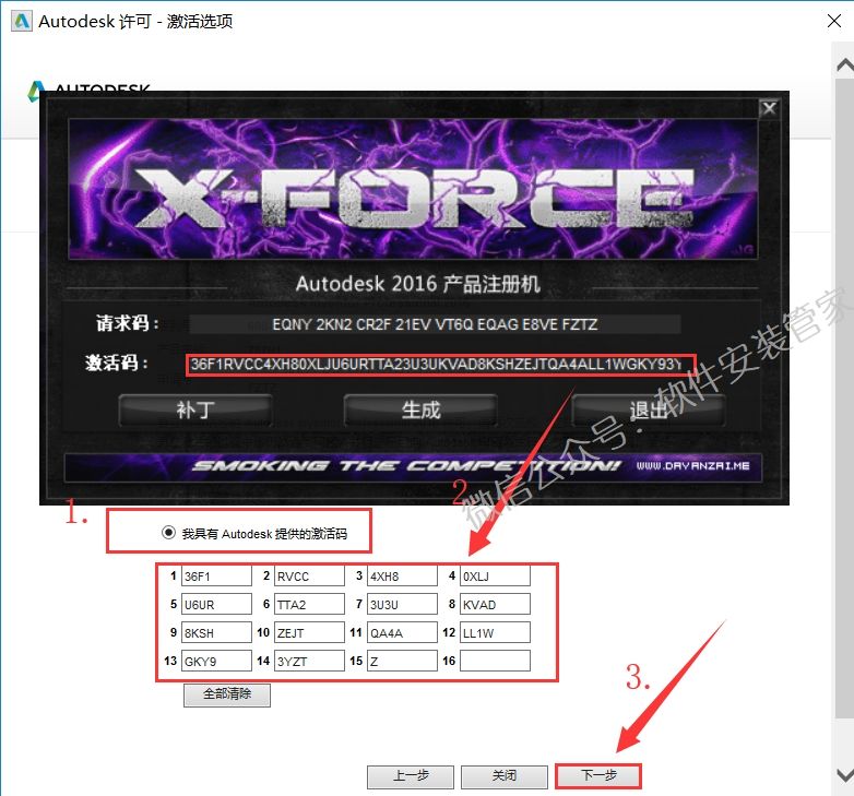 19.点击【我具有Autodesk提供的激活码】,全选【激活码】框里面生成的激活码,Ctrl+C复制,在下面的框中Ctrl+V粘贴,然后点击【下一步】。