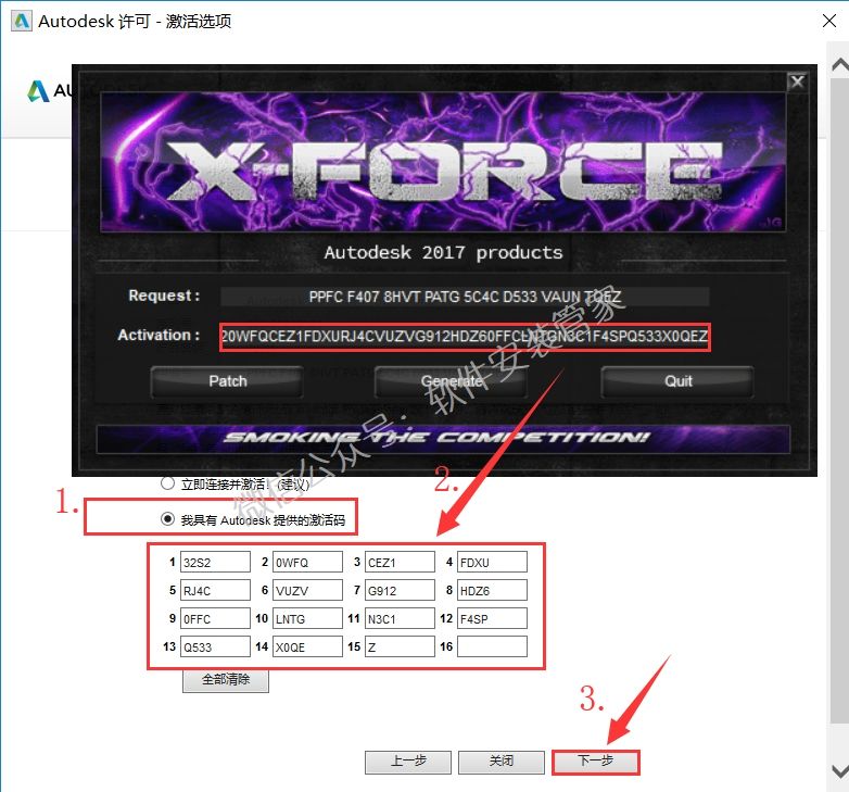 21.点击【我具有Autodesk提供的激活码】,全选【Activation】框里面生成的激活码,Ctrl+C复制,在下面的框中Ctrl+V粘贴,然后点击【下一步】。