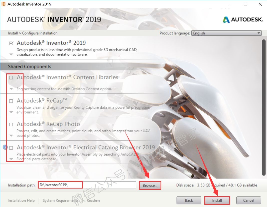 8.共享组件可以取消,点击【Browse】更改软件的安装目录,建议安装在除C盘之外的其他的磁盘,可以在D盘或者其他盘新建一个【Inventor2019】文件夹,然后点击【Install】。
