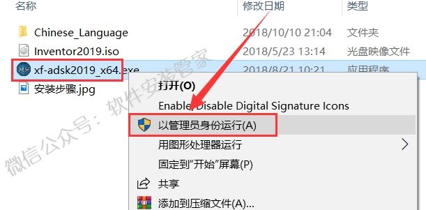 19.打开之前解压后的【Inventor2019】文件夹,选中【xf-adsk2019_64】可执行文件,鼠标右击选择【以管理员身份运行】。