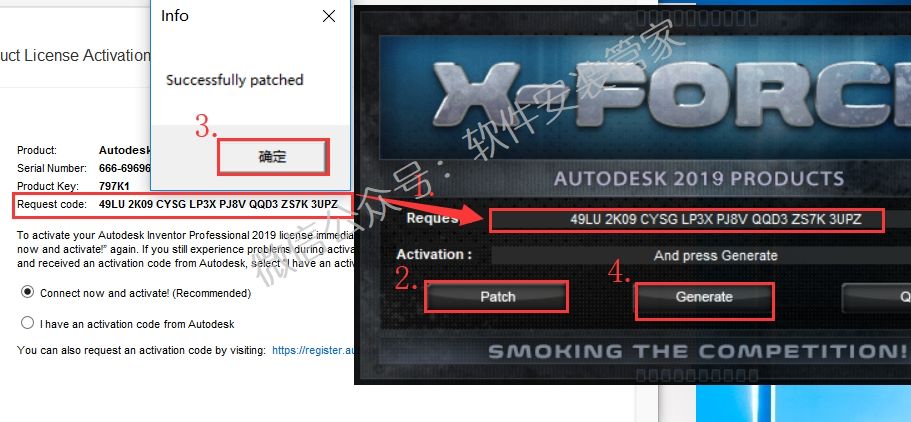 20.使用快捷键Ctrl+C复制【Request code】,快捷键Ctrl+V粘贴到【Request】中,点击【Patch】在弹出来的窗口中点击【确定】,然后点击【Generate】。