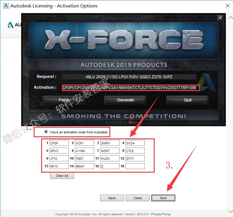 21.点击【I have an activation code from Autodesk】,全选【Activation】框里面生成的激活码,Ctrl+C复制,在下面的框中Ctrl+V粘贴,然后点击【Next】。