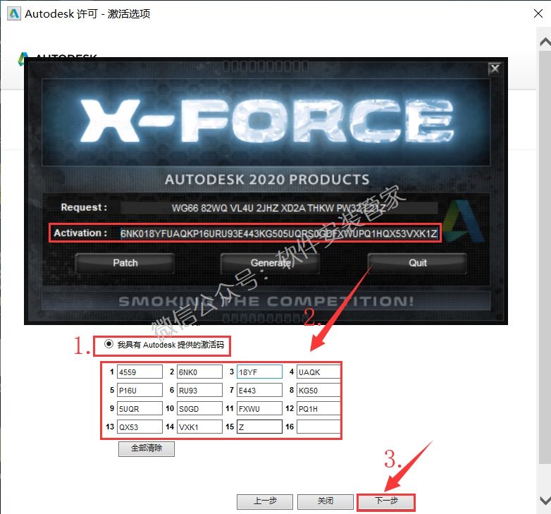 20.点击【我具有Autodesk提供的激活码】,全选【Activation】框里面生成的激活码,Ctrl+C复制,在下面的框中Ctrl+V粘贴,然后点击【下一步】。