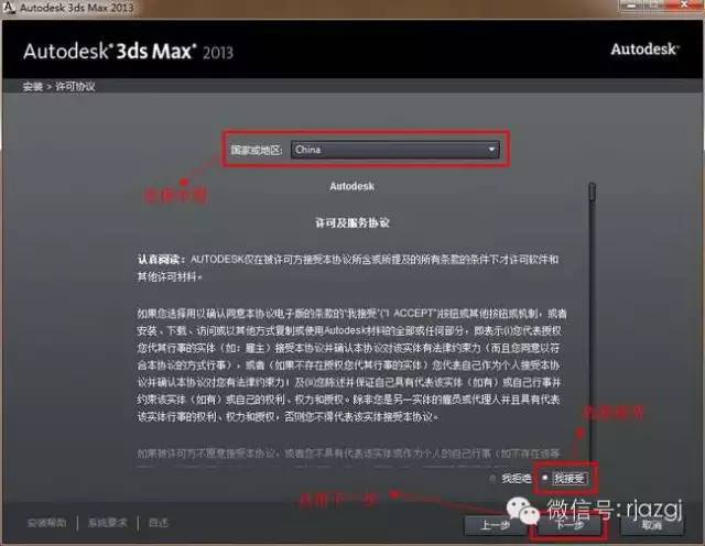 4、国家或地区这里选择中国。下面一栏是选择“接受相关协议 ”。点击下一步