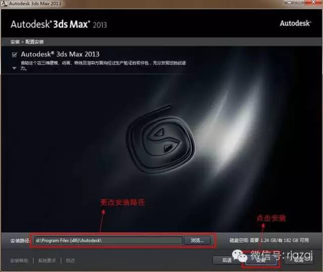 6、3dsmax2013 32位中文版默认是安装在c盘,这里更改安装到d盘里。确认无误后,点击安装,开始安装3dsmax2013 32位中文版