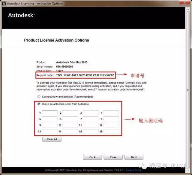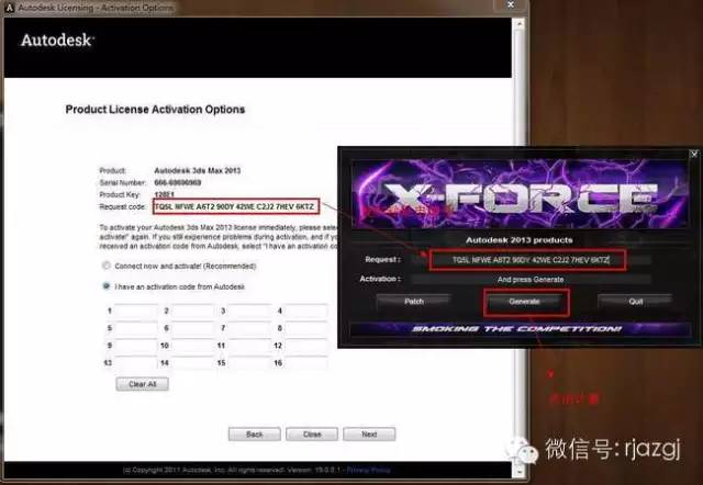 17、3dsmax2013 32位中文版里的申请号复制到注册机申请号栏中,确认无误后,点击计算,生成 激活码