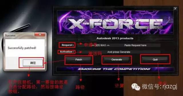 16、运行32位注册机后,我们可以看到如下几个单词:申请号(Request code),激活码(Activation),分配路径(Mem patch),计算(Generate),退出(quit)。当打开32位注册机时,第一步要做的就是先分配路径(注:这步非常重要,要是没有做这步,后面没法激活),点击分配路径(Mem patch),这时会出现一个成功的对话框,然后再点击确定按钮