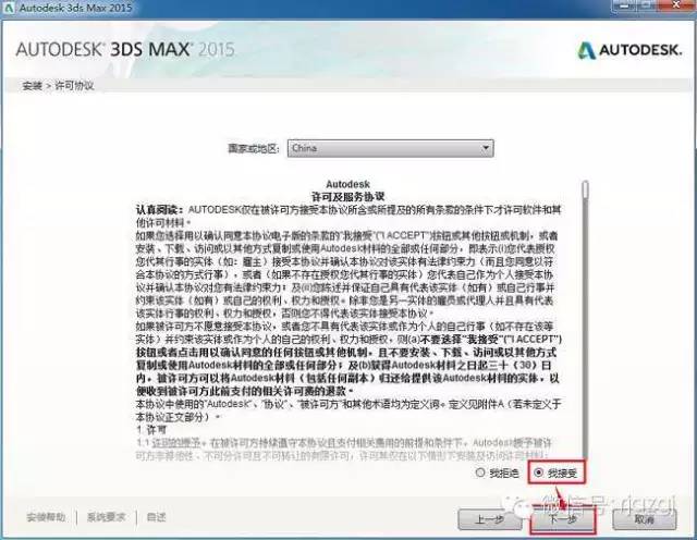 3、选择国家或地区为"china",然后选择我接受许可协议,再点下一步