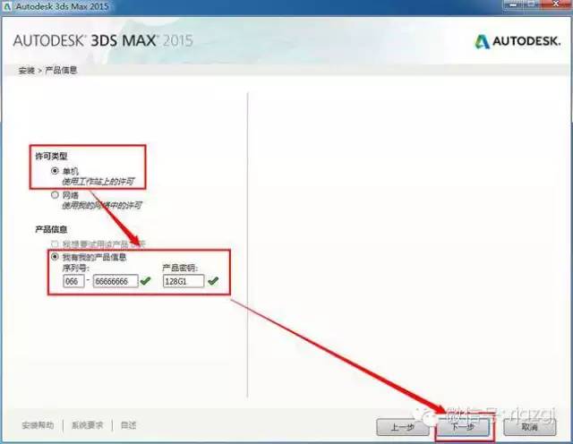 4、安装产品信息,择许可类型为单机,然后将序列号:066-66666666和产品密钥128G1写入产品信息内,点击下一步