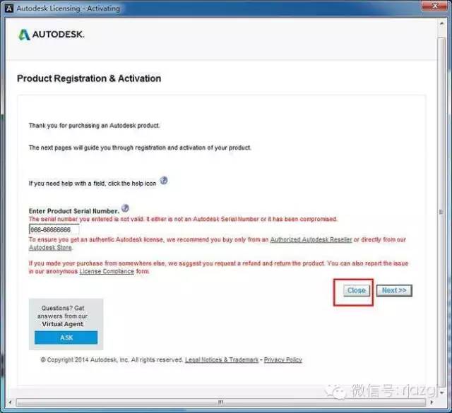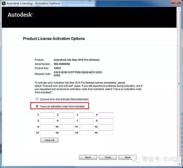 11、我们发现这里跟我们之前版本的MAX激活界面不一样,所以有两种激活方法,一种是断网激活,另外一种就是本教程要讲述的:我们先点击关闭,关闭这次激活,然后返回到之前的激活界面 ,再重新点击激活,这时我们会发现自动跳转到输入激活码界面