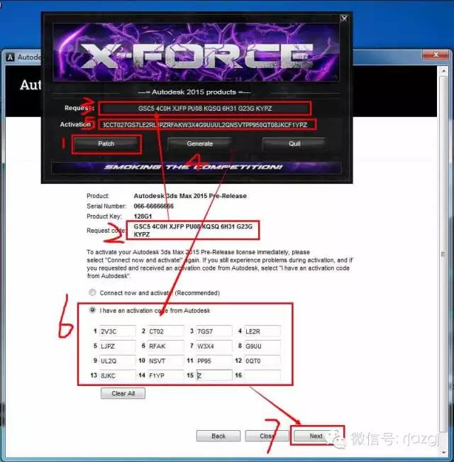 15、这里请先打开MAX2015 64位中/英文版安装包里的注册机,如图所示。按照图示序号操作,首先点击1,Patch;然后把2框里面的申请号复制到注册机3框里面;再点击4,Generate。把5框里面算出的激活码复制到6框里面,然后点击下一步进行激