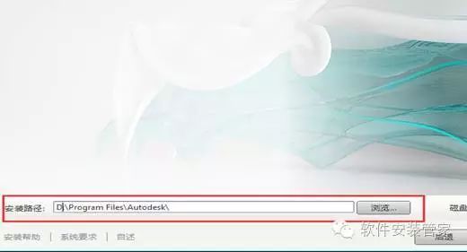 6、安装路径的确认,默认情况下是C盘,一般都不要安装到C盘,所以我这里选择了D盘:"D:\Program Files\Autodesk\" ,然后点击安装