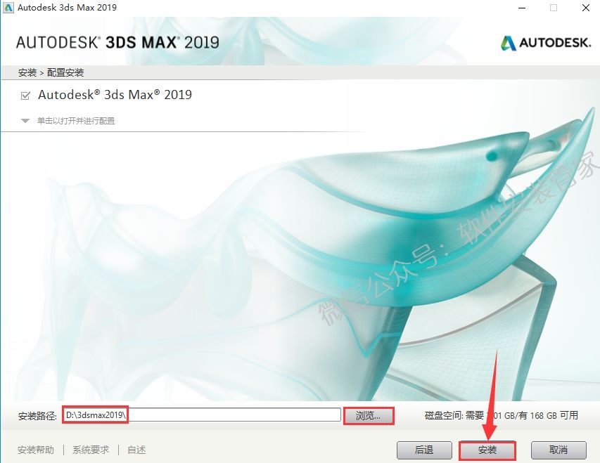 7.点击【浏览】更改软件安装路径:建议安装到除C盘以外的磁盘,可在D盘或其它盘里面新建一个文件夹【3dsmax2019】然后点击【安装】。