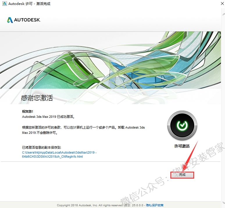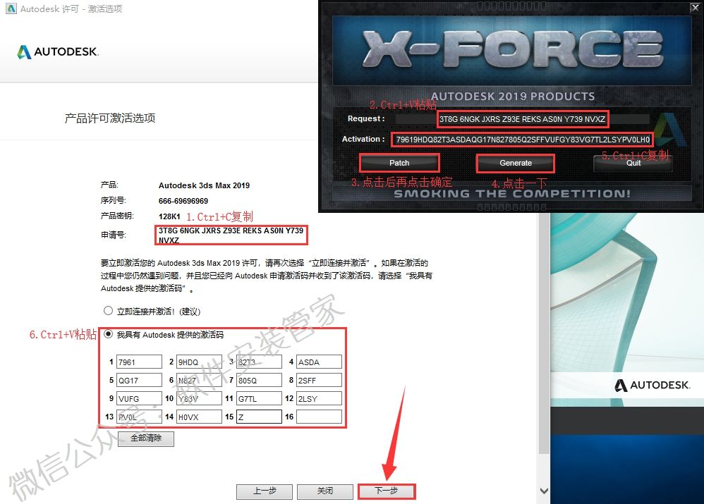 19.把申请号复制到注册机里面的Request中(记得删除原Request中的内容),先点击Patch然后点击确定,再点击Generate后复制Activation中生成的激活码,然后粘贴激活码至我具有Autodesk提供的激活码方框中,最后点击下一步即可。