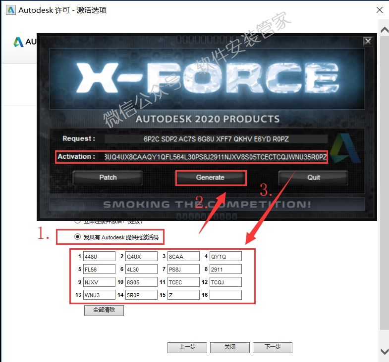 23.选择【我具有Autodesk 提供的激活码】然后点击【Generate】,使用快捷键Ctrl+C复制注册机中生成的激活码,然后使用快捷键Ctrl+V粘贴到软件的激活码输入框中。