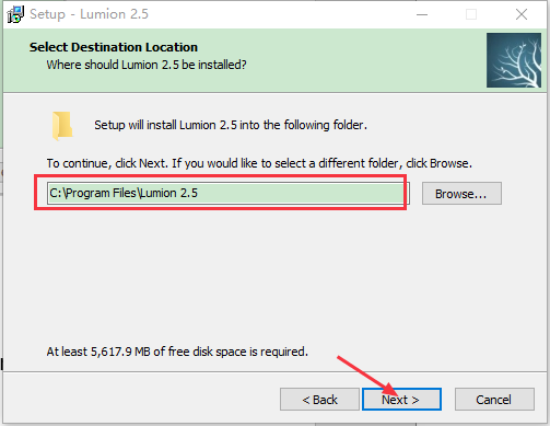 4. 点击Browse更改软件安装目录,默认安装目录在C:\Program Files \Lumion2.5(建议安装在除C盘以外的磁盘中,可在D盘新建一个文件夹Lumion2.5)点击Next