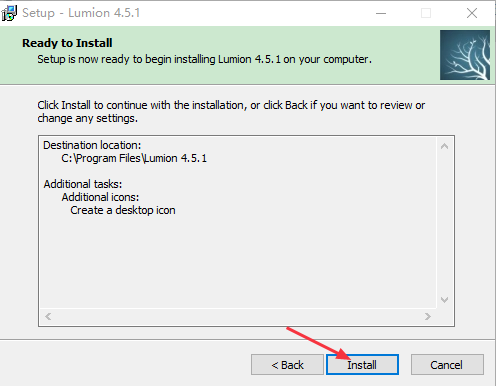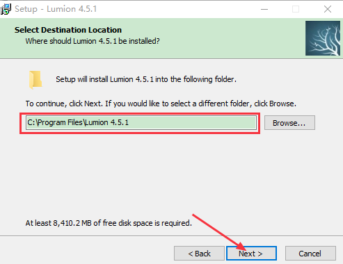 4. 点击Browse更改软件安装目录,默认安装目录在C:\Program Files \Lumion4.5,建议安装在除C盘以外的磁盘中,可在D盘新建一个文件夹Lumion4.5 点击Next