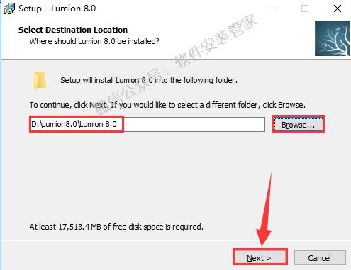 4.点击【Browse】更改软件安装路径:建议安装到除C盘以外的磁盘,可在D盘或其它盘里面新建一个文件夹【Lumion8.0】然后点击【Next】。