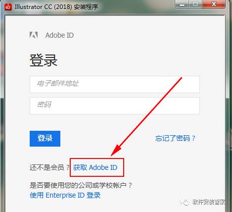 4.首次使用,安装的时候我们需要注册一个账号,点击“获取Adobe ID”;已经有账号的用户可以直接登陆。