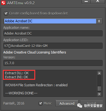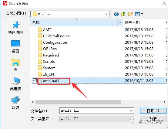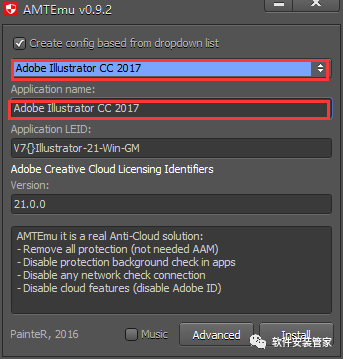 12、选中后点击注册机右下角的Install,然后会跳出文件资源管理器让你找一个dll文件。如果是默认路径就打开C:\Program Files\Adobe\Adobe Illustrator CC 2017\Support Files\Contents\Windows,找到后选择软件根目录下的amtlib.dll 文件,双击打开。