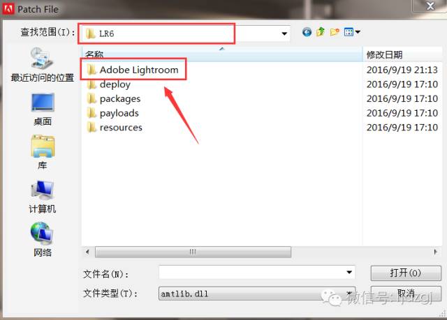 16. 然后浏览你的文件夹,找到刚才的安装路径,在Adobe Lightroom文件夹中找到amtlib.dll文件。再点击打开。然后可以关闭破解工具了。