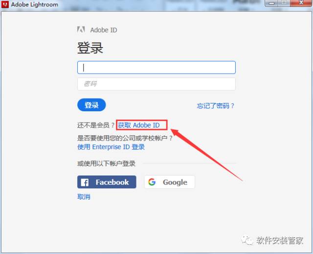3.首次使用,安装的时候我们需要注册一个账号,点击“获取AdobeID”;已经有账号的用户可以直接登陆。