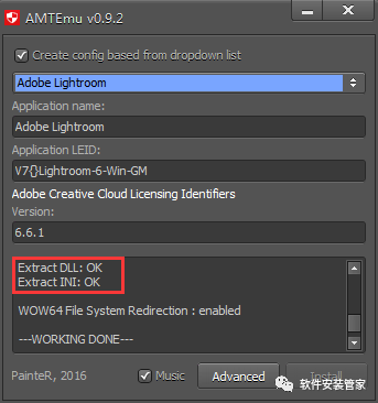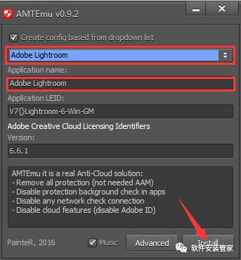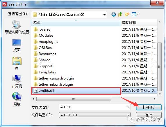 13.选中后点击注册机右下角的Install,然后会跳出文件资源管理器让你找一个dll文件。如果是默认路径就打开C:\Program Files\Adobe\ Adobe Lightroom Classic CC,找到后选择软件根目录下的amtlib.dll ,双击打开。