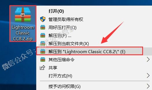 1.选中【Lightroom Classic CC8.2】压缩包,鼠标右击选择【解压到Lightroom Classic CC8.2】。
