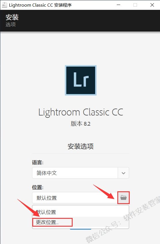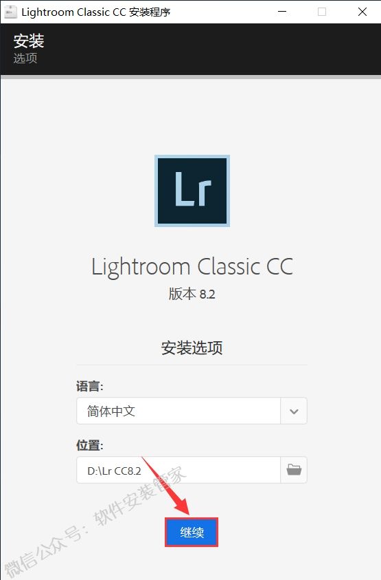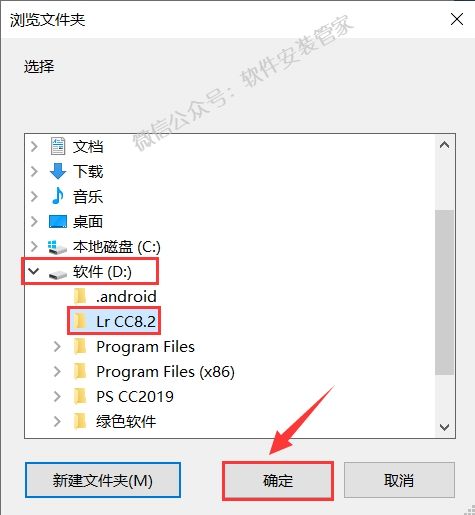 5.建议安装到除C盘以外的磁盘,可以在D盘或其他盘新建一个【Lr CC8.2】文件夹,然后点击【确定】。