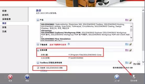 6.选择安装路径,我这里选择更改把路径设置在F盘,用户可自定义安装路径;勾选我接受条款,点击现在安装