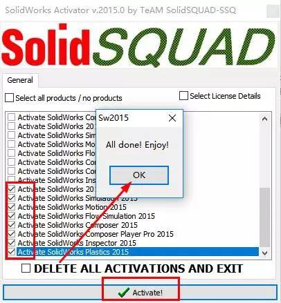 11.勾选activate solidworks2015的所有选项,点击Activate,点击OK
