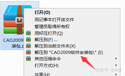 1.右击软件压缩包,选择解压到CAD2009软件安装包