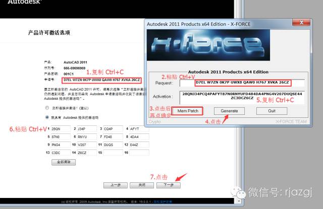 19.把申请号复制到注册机里面,先点击Mem Patch,再点击Generate后复制激活码, 粘贴激活码后点击下一步即可。