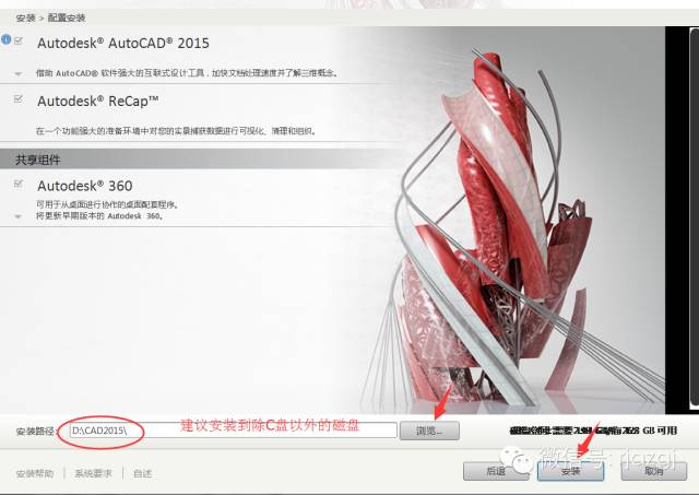 6.点击浏览更改软件安装路径:建议安装到除C盘以外的磁盘,可在D盘或其它盘里面新建一个文件夹CAD2015。点击安装。