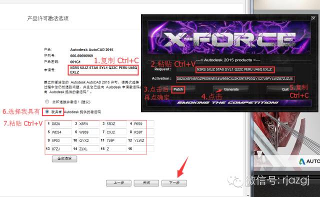 12.把申请号复制到注册机里面的Request中(记得删除原Request中的内容),先点击Patch,再点击Generate后复制Activeation中生成的激活码,然后粘贴激活码至我具有Autodesk提供的激活码方框中。最后点击下一步即可。