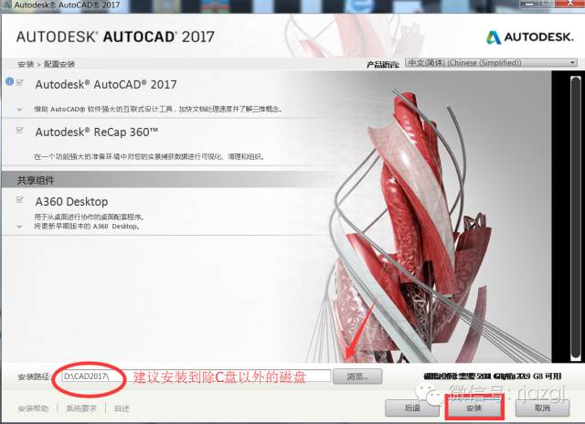 6.点击浏览更改软件安装路径:建议安装到除C盘以外的磁盘,可选择之前在D盘或其它盘里面新建的那个文件夹CAD2017。然后点击安装。