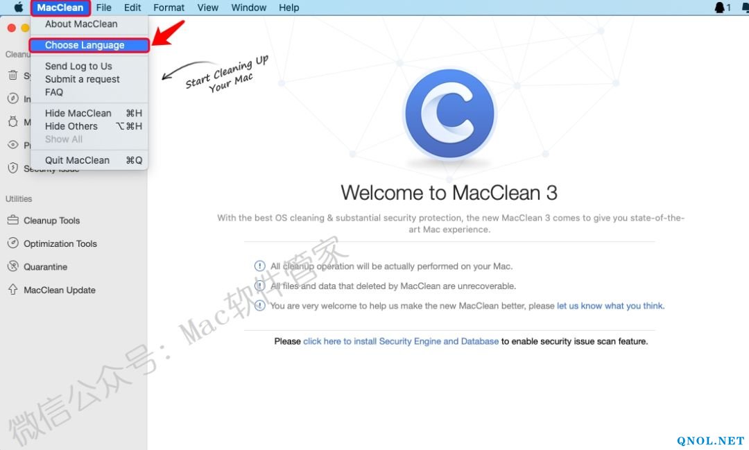 1)点击【MacClean】选择【Choose Language】。