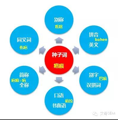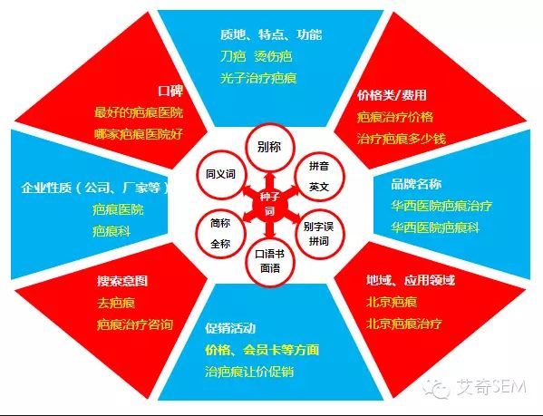 从网民关注点出发,将六维拓展词(疤痕)作为种子词,向八个方向做广度拓展。这是最常用的一种思路,记得收藏。