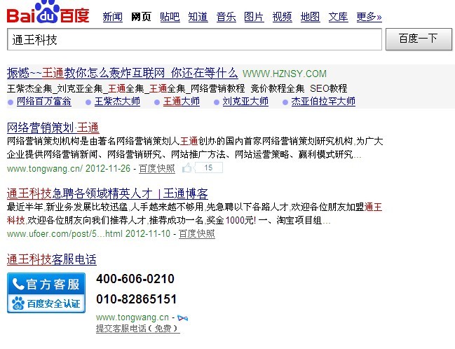该如何做百度安全认证呢?接下来我将教你一步步来操作。可能很多人找不到百度安全认证的入口,最简单的方法你可以在百度上搜一个做过认证的公司品牌名称,例如搜我们的公司品牌名称:通王科技,可以看到下图所示: