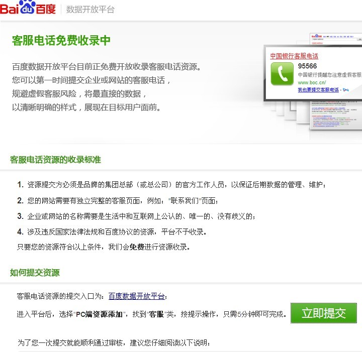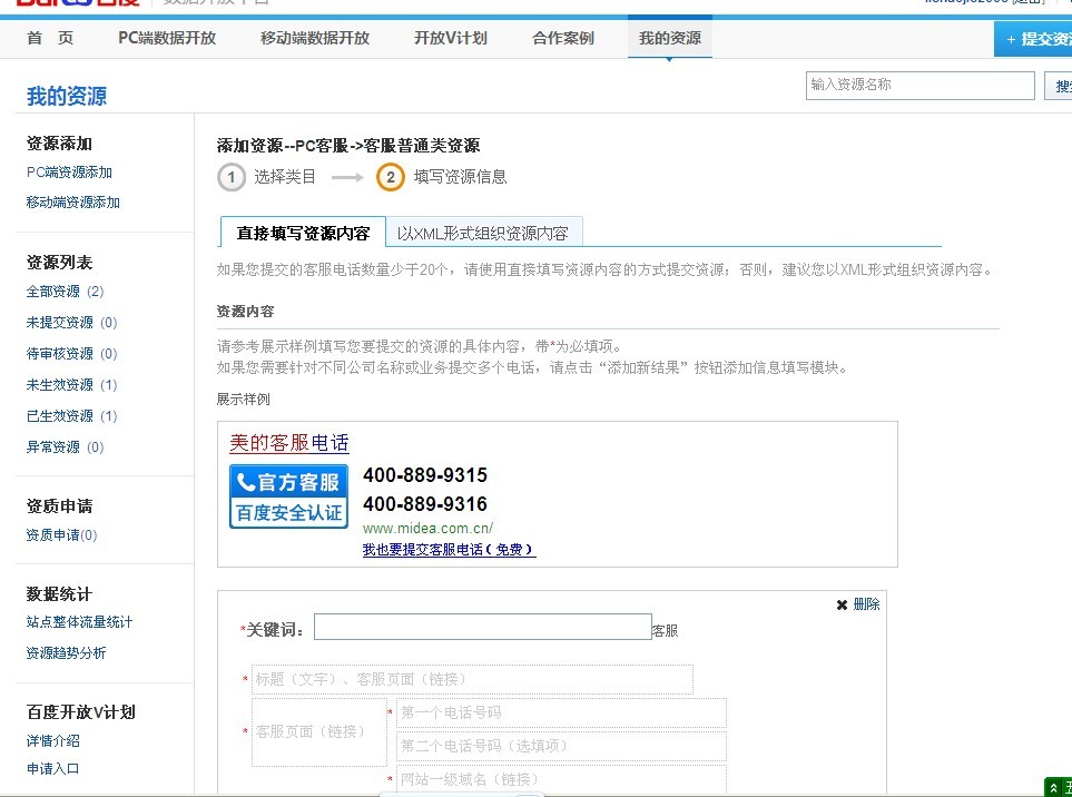 点击我们公司品牌百度安全认证的客服电话下面的提交客服电话(免费) 进入百度安全认证数据开放平台,如图: