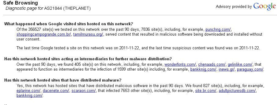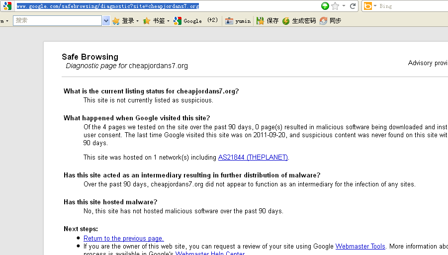 3. 检查你的网站,网站IP是否被google列入黑名单, http://www.google.com/safebrowsing/diagnostic?site=mysite.com 替换mysite.com成你的网站。 比如