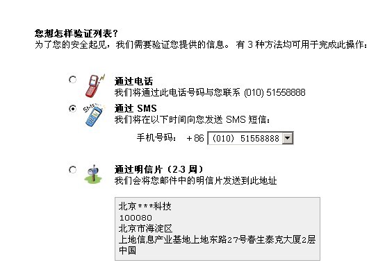 三、全部填写完毕后会自动跳转到本地商户中心管理页面,选择验证方式,通过电话,通过(sms)短信和通过明信片3种方式,推荐使用通过(sms)短信,几分钟后就会受到验证码!