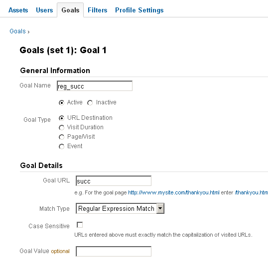 假设我们的注册页地址是:reg.aspx?source={渠道编码},注册成功的页面地址是:succ.aspx,首先需要指定目标,创建一个新的网址目标: