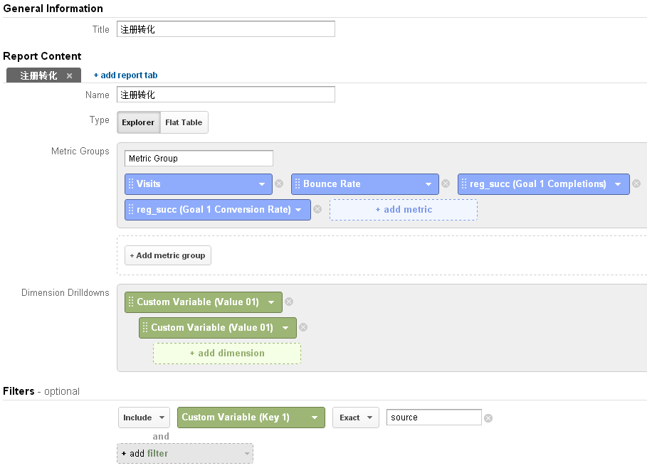 然后要做的就是创建自定义报表,按用户渠道看转化率了: