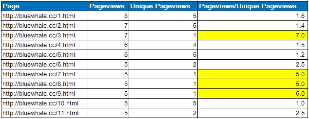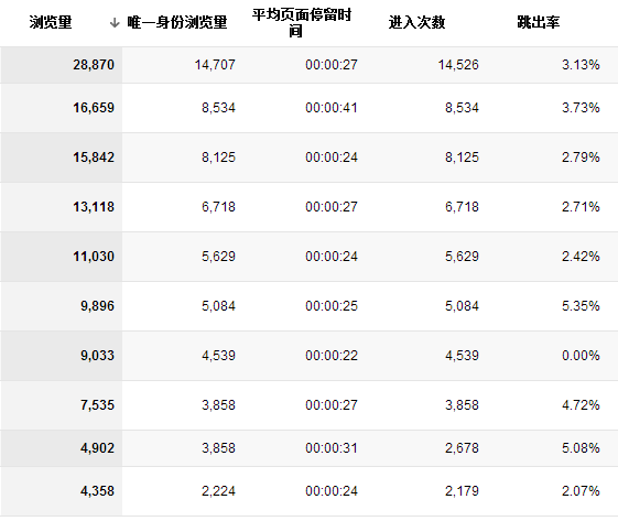 Pageviews表示页面浏览量,而Unique Pageviews则表示每个页面获得的唯一页面浏览量,相当于每个页面获得的访问次数。在一次访问中,用户多次浏览一个页面只会造成Pageviews的增加,而Unique Pageviews是不会增加的。因此,我们将不同的页面作为维度,使用Pageviews和Unique Pageviews两个指标相除就可以看到一次访问中访问者浏览同一个页面的次数。通常来讲,访问者在一次访问中是不会多次浏览一个相同的页面的。所以,如果如果Pageviews/Unique Pageviews的值很高,那么这部分流量就值得注意了。当然,这并不是一个绝对的标准。为了确保万无一失,最好的方法是将这部分流量的Pageviews/Unique Pageviews值与这些页面在整站中的值进行对比。