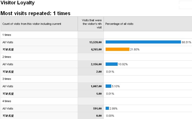 访客忠诚度是对一段时间内访客回访频率进行的分析。通常来讲,当一定数量的访问者来到你的网站后,总会有一部分访问者会再次访问的。即使这部分访问者非常少。哪怕只有一两个。这就好像在一个页面中,即使有些链接放在非常隐蔽的位置,也总还是会有人点击的,即使比例非常的少。记得一个真实的教训,我们为客户分析一个wap网站时,发现页面中的一个链接点击量是0。当时想当然的认为这个链接因为提供在线电影,流量和费用都很高,所以没人点击也是正常的。但实际情况却和我们想象的完全不一样。