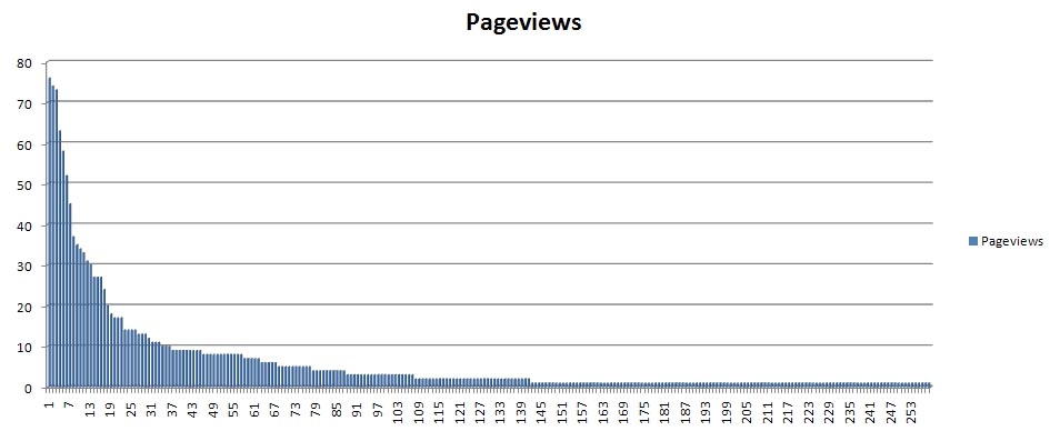 热门内容是在整个访问过程中最受欢迎的页面。上图是网站中热门内容的浏览量趋势图。因为每个访问者的目的都不相同,所以除了最受欢迎的页面之外,还会有很多页面也会被浏览,并且大部分页面获得的浏览量都很少,只有1-2次。这些就是页面访问的长尾,他们充分的表现了真实访客浏览网站的自然性和多样性。同样,对于退出页面也必然会存在这样的长尾,因为访问者会在不同的页面结束访问。