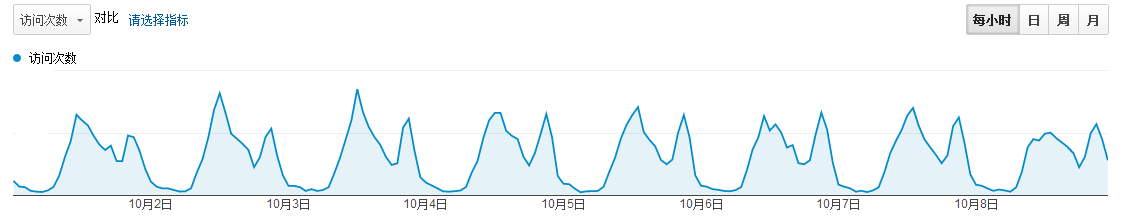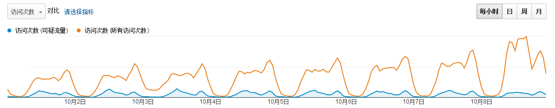 在这个案例中我们发现流量异常的突破点在流量的时间段上,也就是下面的10月1日——10月8日。首先,只有在正常的工作日才会有早上,下午和晚上的三个访问时间段高峰出现。而对于节假日,尤其是大型的节假日来说则不会出现这个规律。其次,在节假日中,访问者使用互联网的时间通常会比平时有所下降。而在下面的图表中十一长假期间依然保持了和工作日相同的访问规律就显得十分可疑。